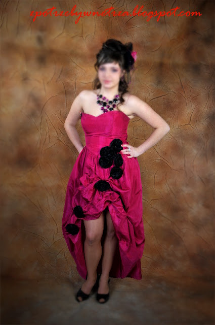 Sukienka odpowiednio udrapowana zmieniła swoje oblicze na -bardziej modową.W tym wypadku studniówkową.Mój wkład w nią to kwiaty.Draperie podobaja mi się -jednak to nie mój styl.Jednak nie ukrywam dziewczyna wyglądała fajnie.(dla mnie trochę za dużo dodatków)Same wiecie -gust gustowi nie równy.Wygląd był ,więc efekt zamierzony, został osiagnięty..